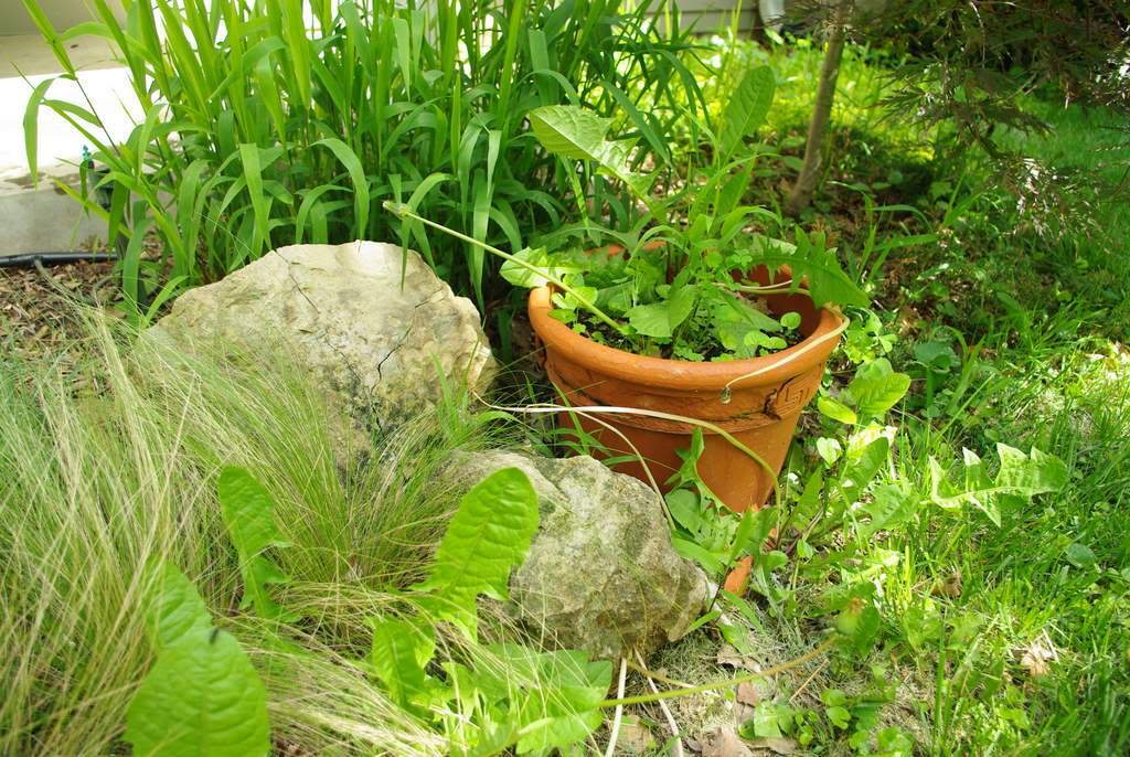 This bed had become a bit rundown lately, with a terracotta pot that is disintegrating, several weeds (mostly dandelions), and a plant that is no longer welcome: