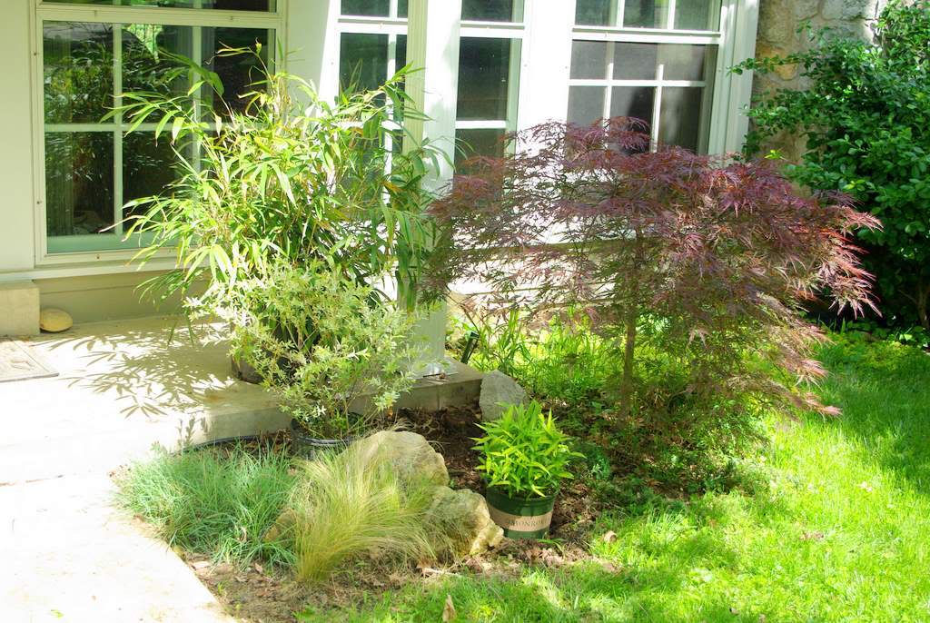 I'm not sure that I like the arrow bamboo, dappled willow, and small potted bamboo here, but I'll leave them for a few days and see how I feel about it then. I partially buried the pots to get the plants closer to the height they'd be in the ground and to help hide the pots while I make my decision. Something with larger leaves will probably look better.