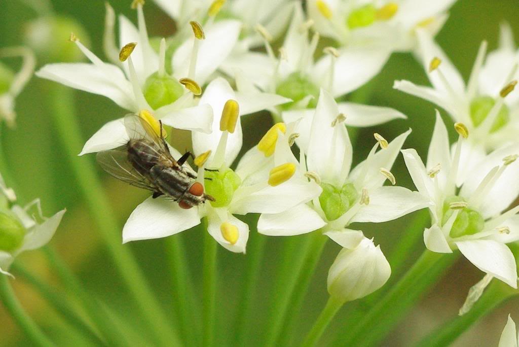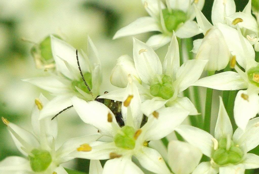 First, it was impossible to get a photo of the garlic chives without getting at least one insect in the shot. Even the photo above has somebody hiding behind a tiny bloom: