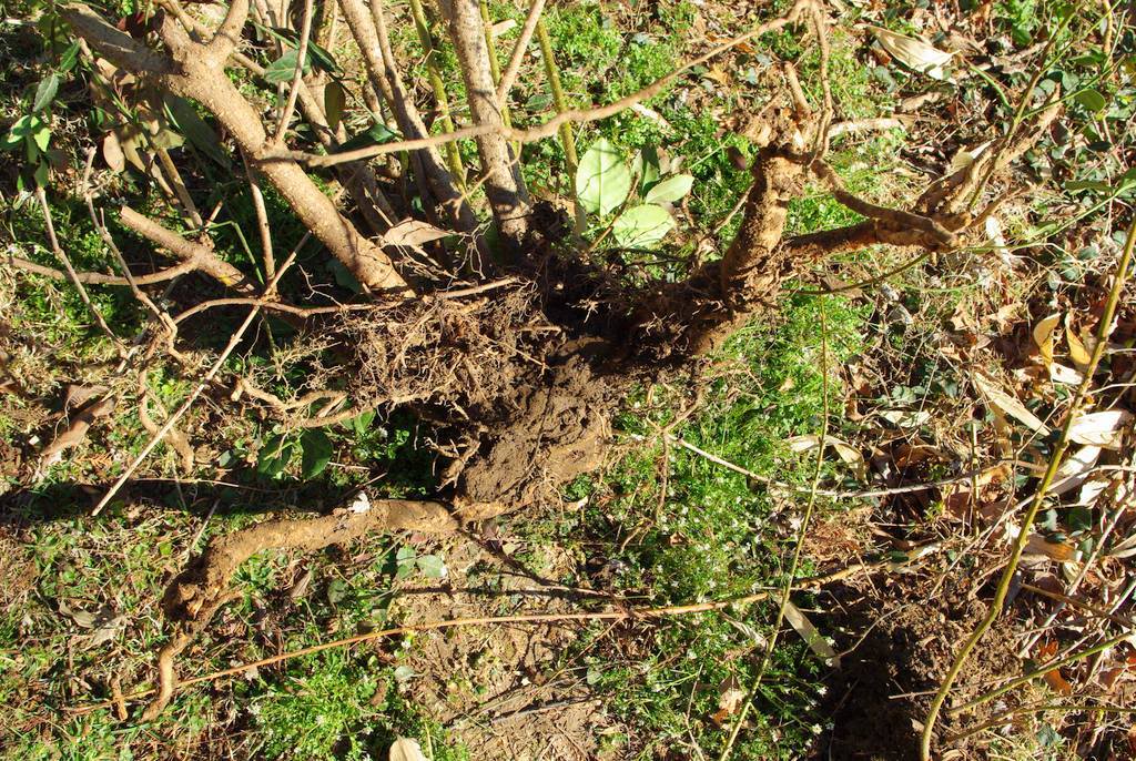 The thing about Forsythia is that it quite easily spreads when branches touch the ground and take root. Here's an example of this -- these roots were formed in the mulch: