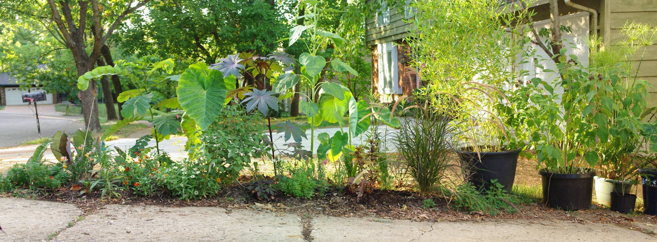 There are a few potted plants at the end of this bed: some bamboo, my hibiscus, another Colocasia, papyrus, and this Ensete:
