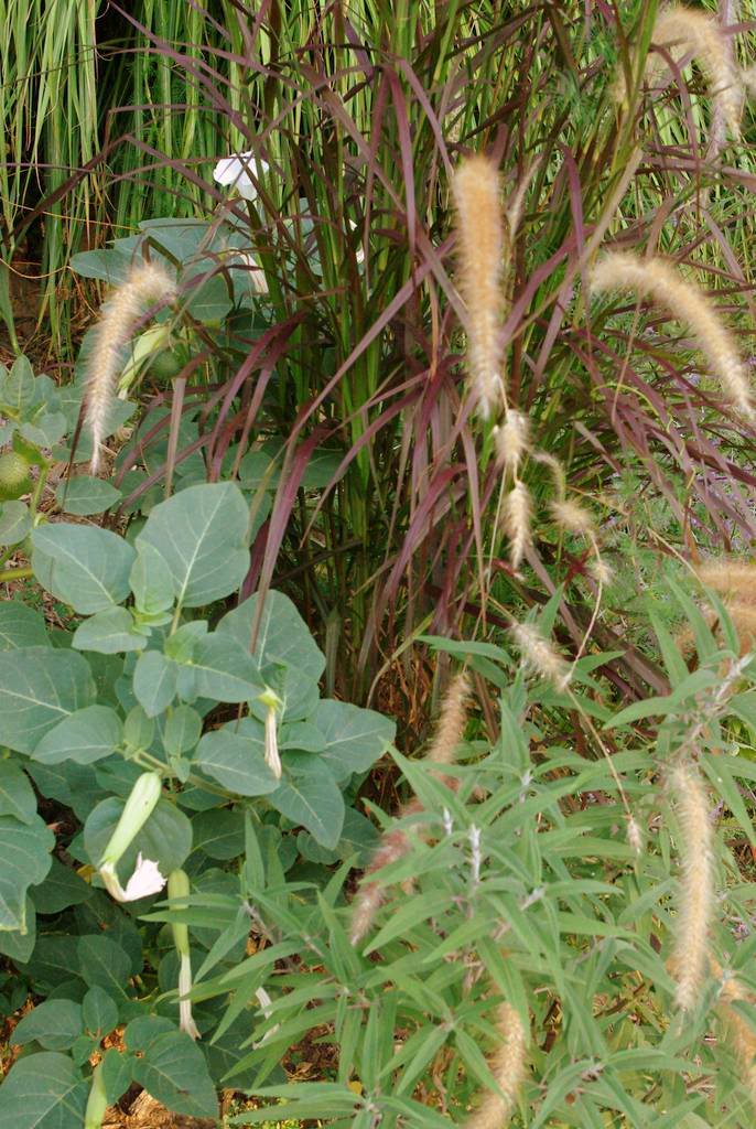 This one looked better earlier in the year before it flopped over, but I still love the contrast with the purple fountain grass.
