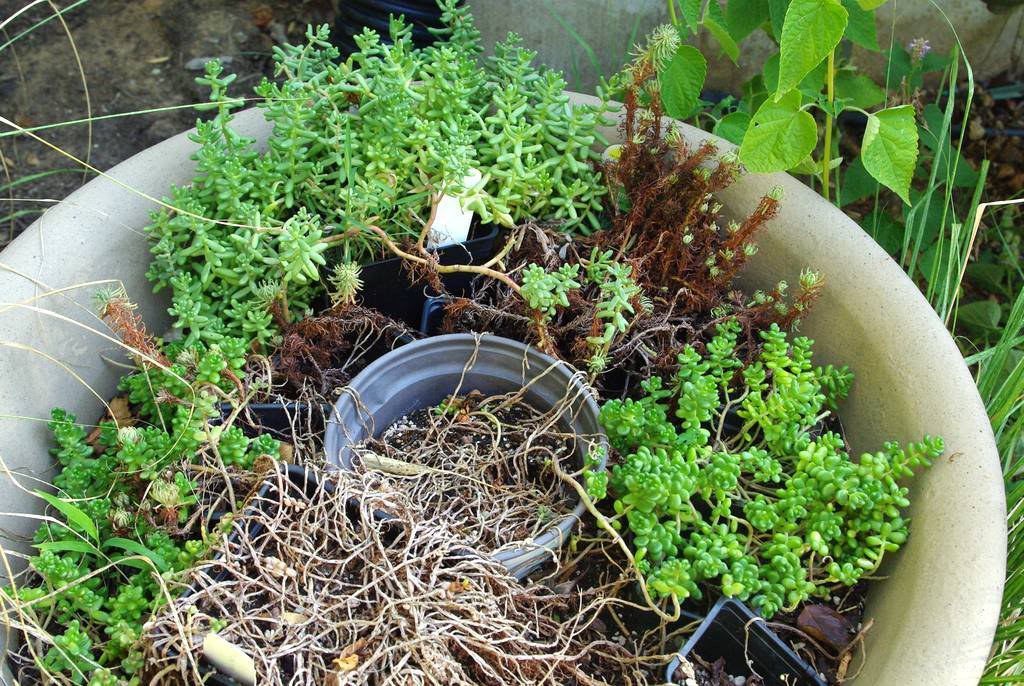 See this pot of heat-ravaged sedum? Last year this contained Colocasia, and it was going to this year again too. I put the sedum there last fall as a place they could overwinter. They did beautifully too -- until June came around with its record heat and fried many of them. So today at long last I move them.