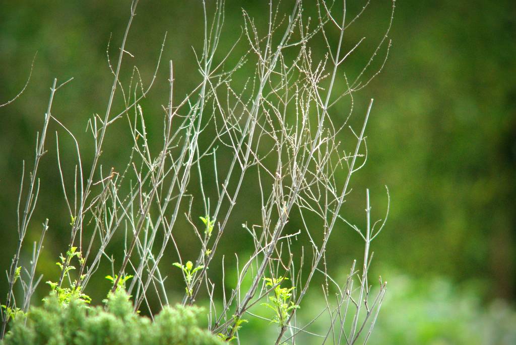 It was shaking quite a bit, then stopped and a female cardinal hopped into view with a few small branches in her beak. She was building a nest, and snapping the fragrant twigs off to use in it! (I doubt it was the scent of the plant that attracted her, as most birds have a poor sense of smell.)