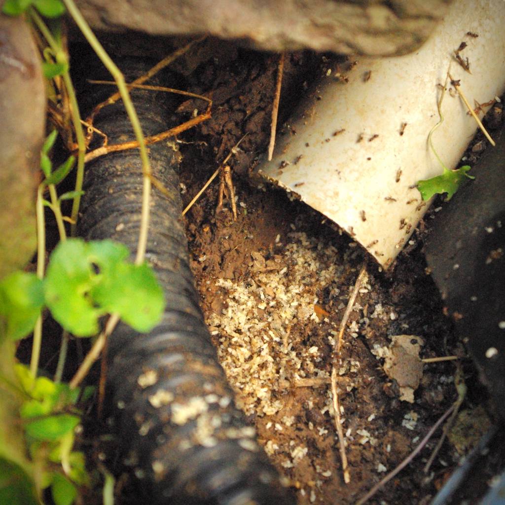 As I tried feeding the cord from the new pump through the buried conduit tube, I found its way blocked by an ant nest: