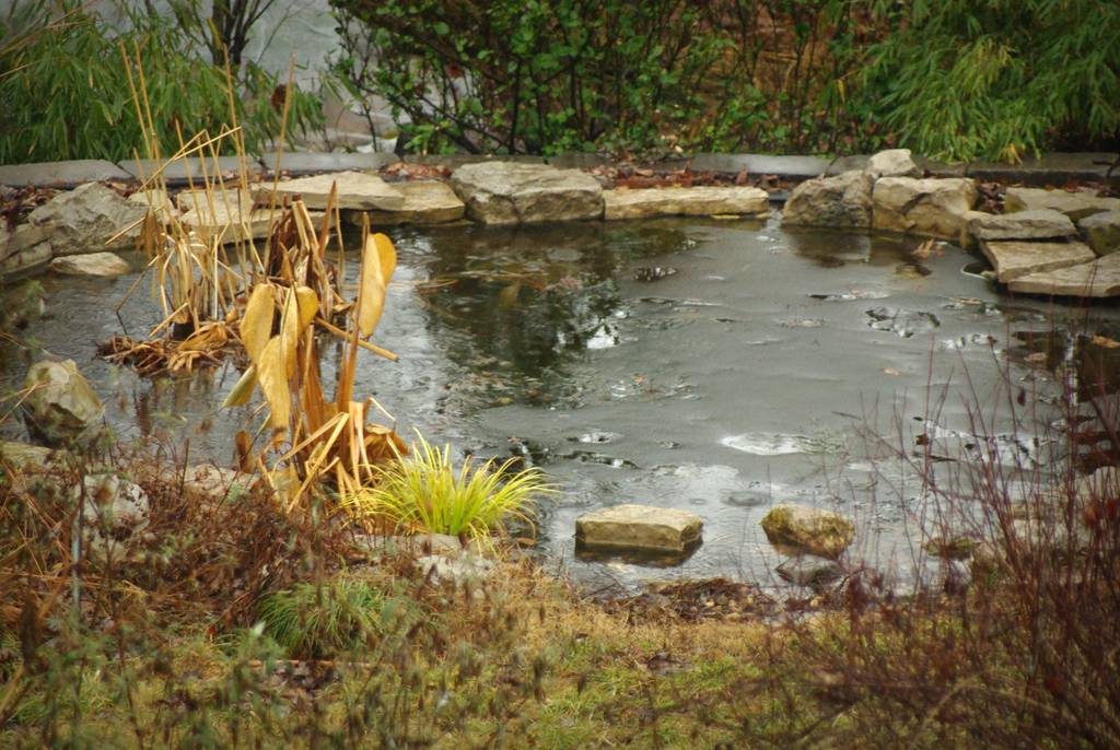 ...but as you can see our brief warm-up (with temperatures in the upper 60's F) has taken care of most of the ice for me right now. It was raining when I dumped the bacteria so I couldn't linger, but I did see a couple of orange fish swimming around.