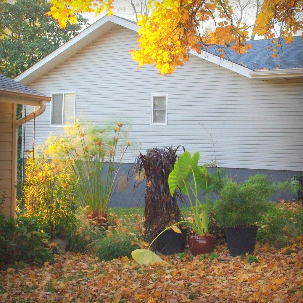Sure, there are extra tasks in the autumn, raking the fallen leaves being the most obvious and universal -- my neighbor is being very methodical about it this year (see photo above)!