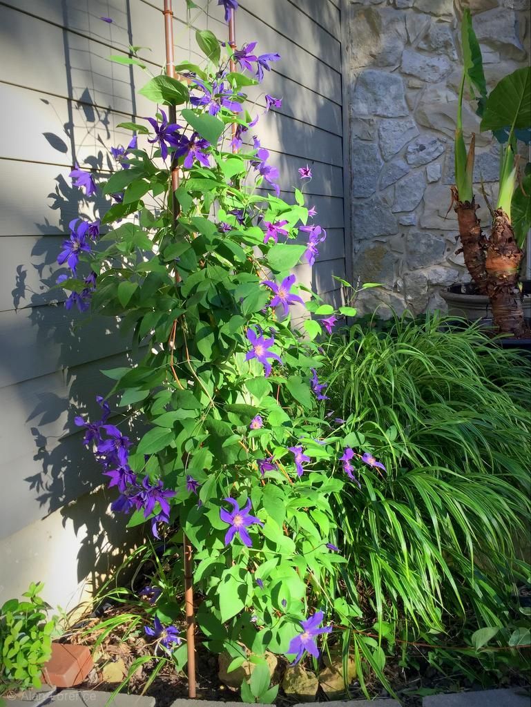 The purple clematis are doing quite well, both the unknown one (maybe 'The President')...