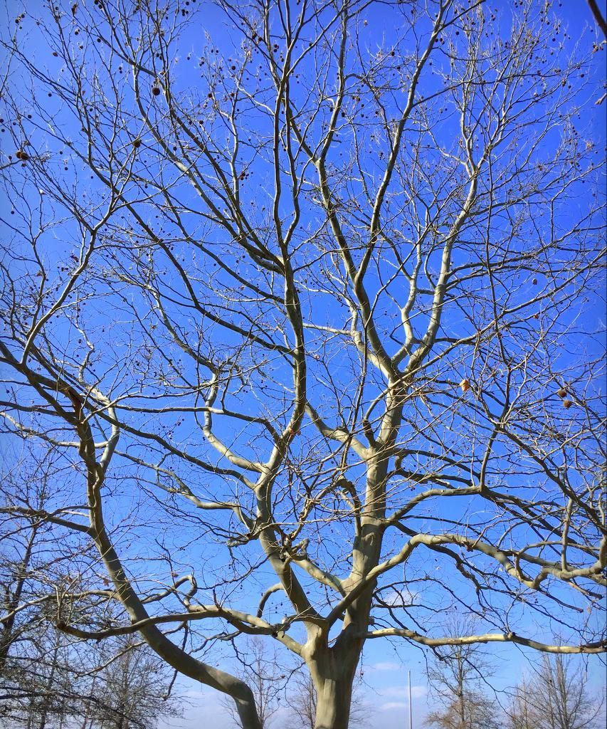 A need to stretch my legs let me discover these wonderful trees at a rest area somewhere between Springfield (Illinois) and St. Louis. Mainly sycamores, which are probably the best trees to see around here in the sunlight against a blue late winter sky.