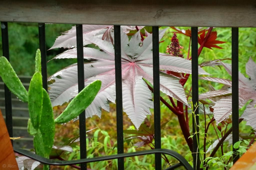 Your photos practically drip moisture. I just bought my first amorphophallus, so now I need to pay attention as far as keeping it alive. The vines on the deck are a great idea. I do like the honeyvine, and that cardinal vine seems perfectly placed weaving around that handrail to show off those finely cut leaves.