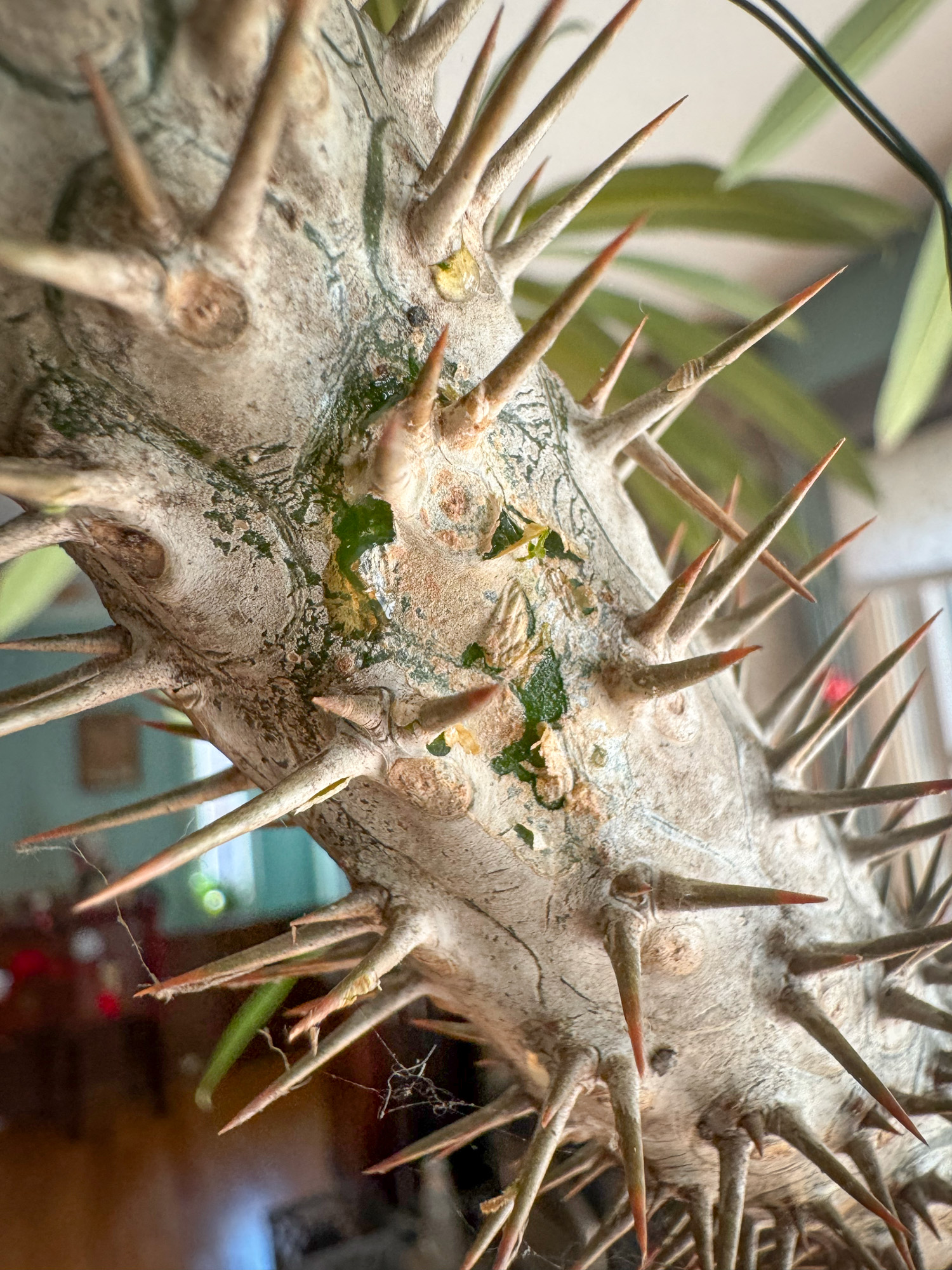 ...where in this case the "easy" (mantis egg case) was hiding behind what looked to be pretty difficult: the spiky stem of my Madagascar Palm. This fearsome-looking plant